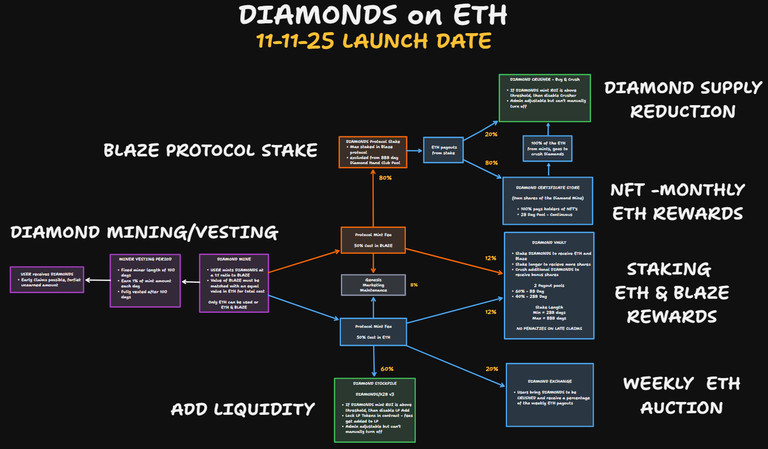Holders of DIAMOND CERTIFICATES (NFT's) earn ETH rewards - 80% of the BLAZE that is taken in from mining, is then staked by the DIAMONDS protocol, via public callable functions into the BLAZE protocol staking. This staking is excluded from the 888 DAY, BLAZE DIAMOND HAND CLUB PAYOUT POOL